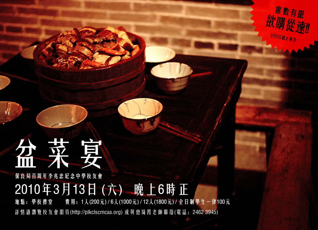 歡迎大家重返校園,並希望大家能把這訊息傳予你所認識的校友。由於盆菜圍數有限,各位校友報名從速,先到先得,我們會個別通知成功報名的校友,不成功者將以支票形式退款。期望當天能見到你的出現,一起共渡愉快的一天。