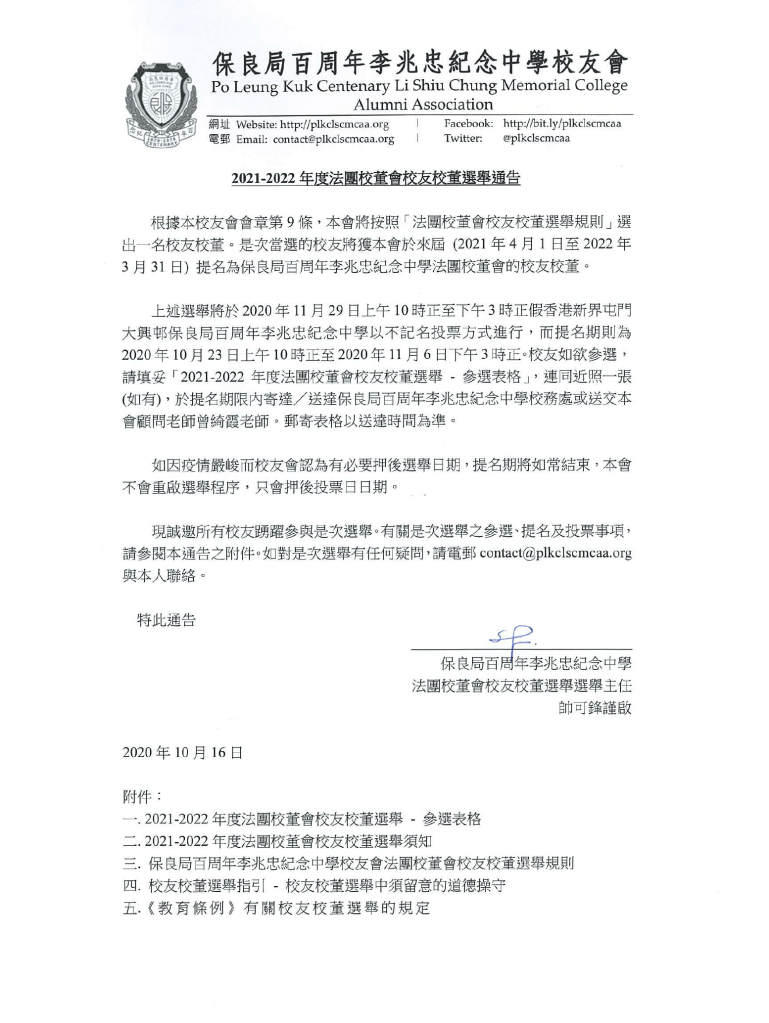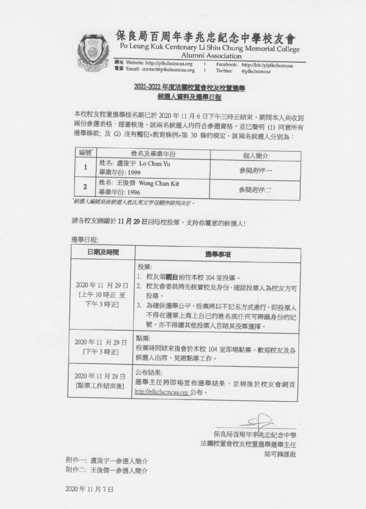根據選舉通告,本會將不會重啟選舉程序,候選人名單及選舉程序將維持不變,投票日期現改為2021年1月17日(星期日),視乎疫情情況或會再度延後。本會將繼續密切留意疫情情況,在保障校友及學生的安全健康的前提下盡快舉行投票日。如有任何疑問,歡迎電郵contact@plkclscmcaa.org 聯絡本會。不便之處,敬請原諒。
